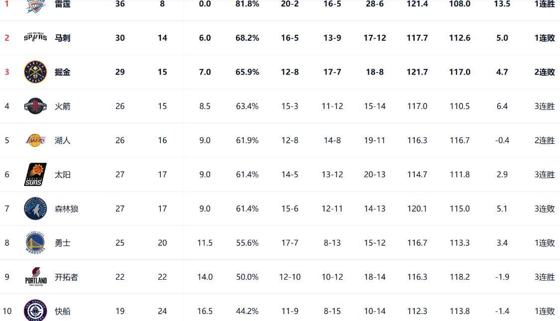 从目前西部的排名来看,雷霆仍然是以36胜8负,排名西部第一,他们领先第二名的马刺6个胜场。西部前三的争夺相比起第三到第七位不是特别激烈,掘金和火箭分列二、三位。