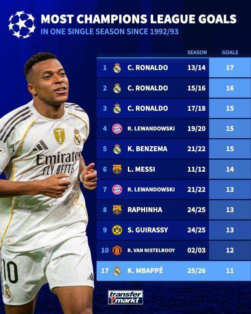 姆巴佩本赛季欧冠6场11球,距C罗纪录还有6球